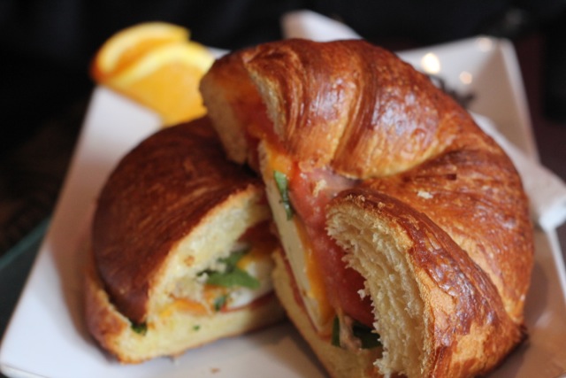 Breakfast sandwich in a croissant (Egg, tomato, basil, cheddar, and bacon+$0.75) — delicious.
