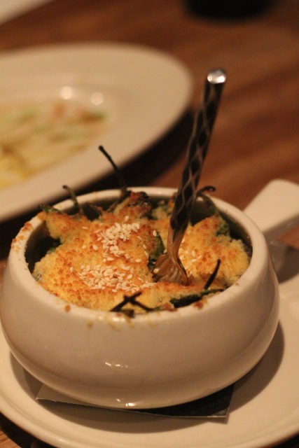 Pan fried shishito peppers with parmesan, sesame and miso. Shishito peppers aren’t known to be spicy, but I was lucky enough to get one spicy pepper in there.