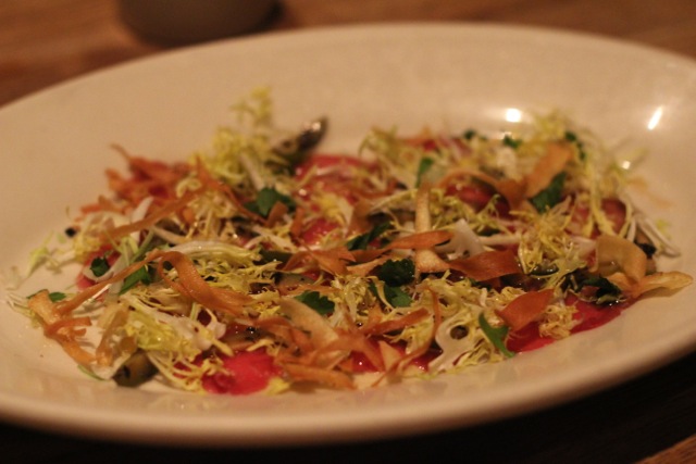 This was surpringly good and not gamey. Goat carpaccio with smoked trout roe and olive-maple vinaigrette.
