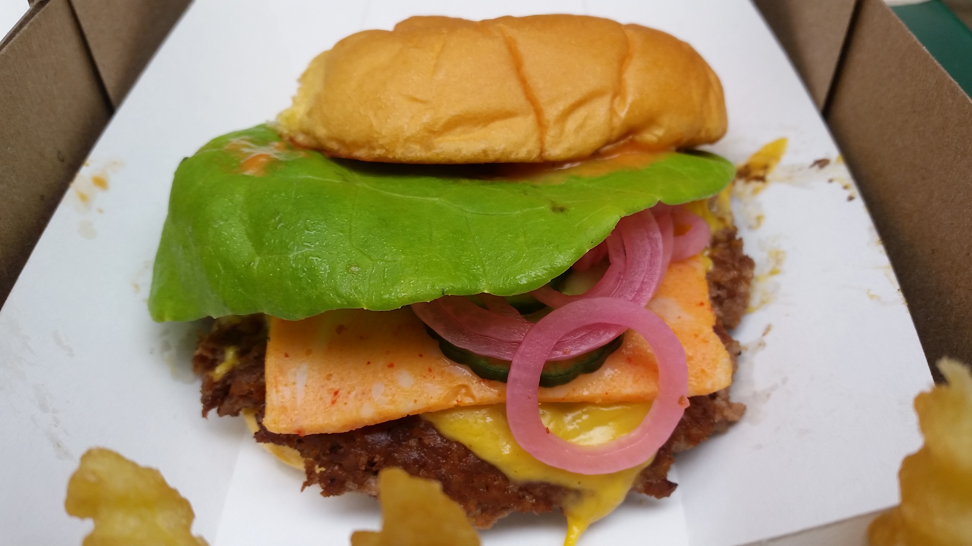 Shack beef-blend cheeseburger topped with smoked and griddled shrimp patty, Momofuku Hozon Sauce, Bibb lettuce, pickled onion and salted cucumber.