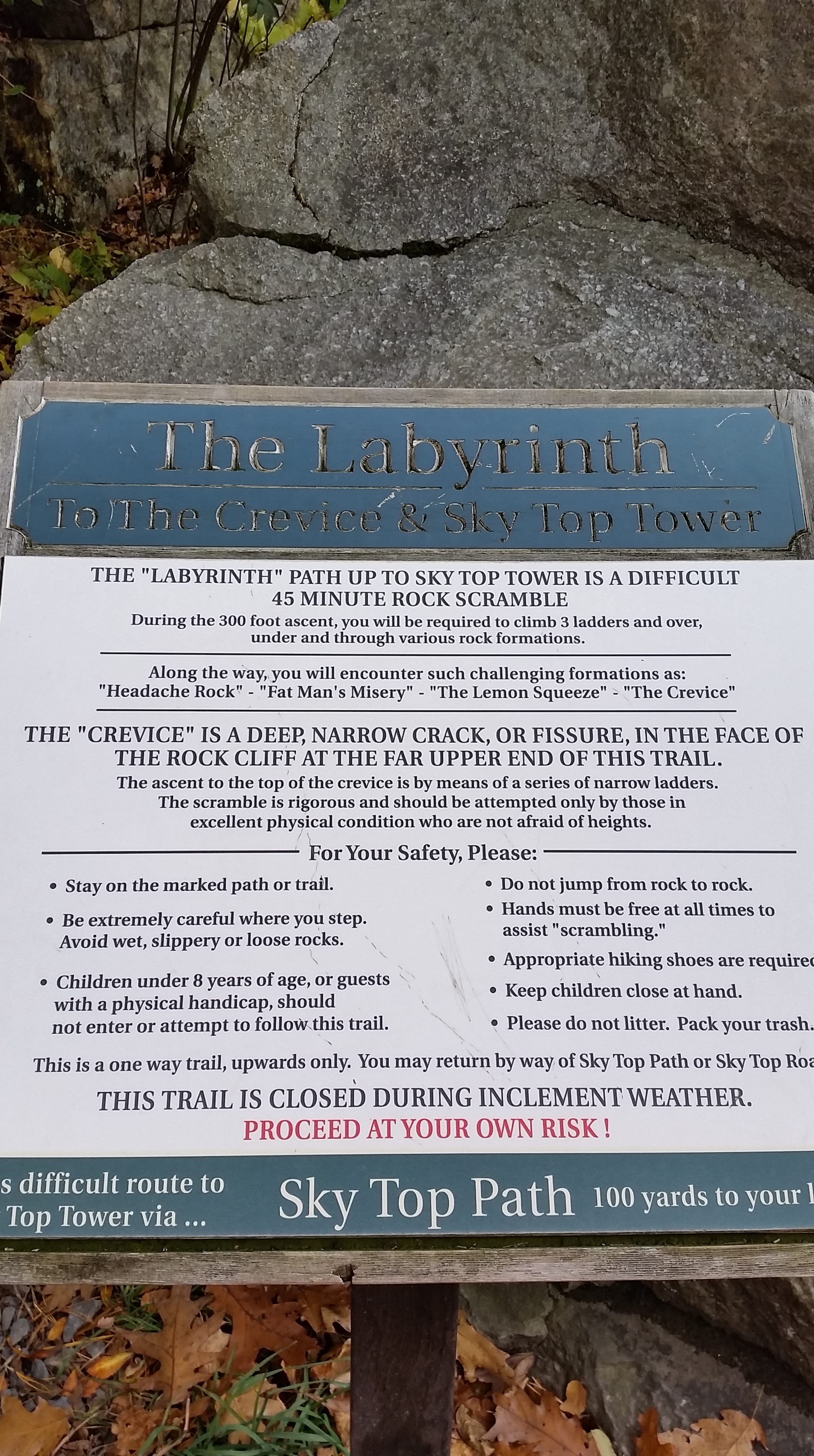 We went on a Friday — the entrance fee was $21 as opposed to $26 on the weekends. Our goal of the day was to find the Sky Top Tower while scrambling and squeezing through/under/over rocks. You can call Mohonk for a recorded message on hiking conditions at 845-256-2197. We called before we left in case it closed for inclement weather.
