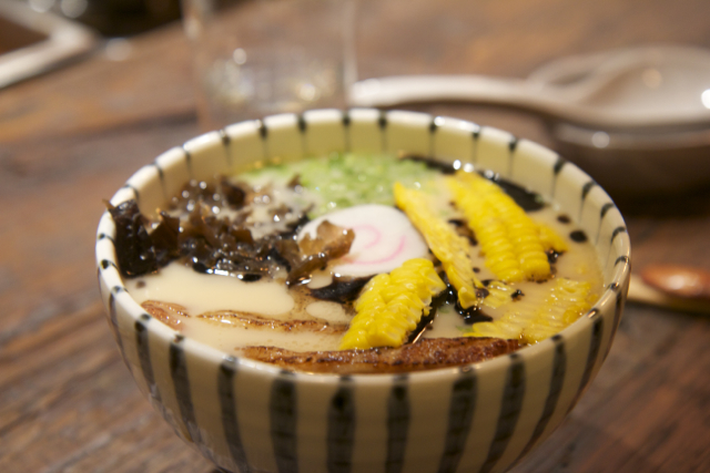 Next, Tonkotsu 2.0: pork based soup topped with chashu pork jowl, kikurage, menma, sesame, and scallions. Also added (at extra charge): roasted corn — HIGHLY RECOMMENDED.