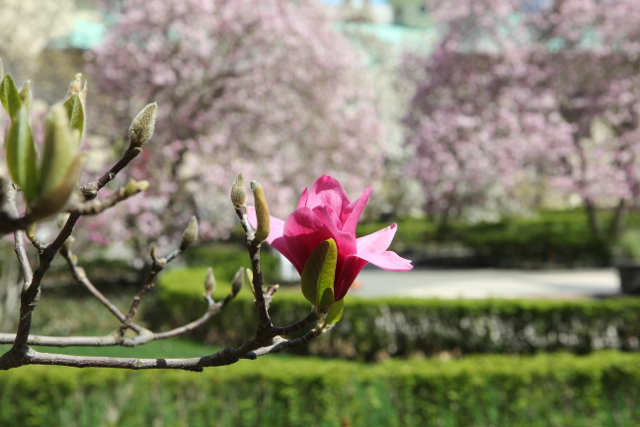 When I visited last year in May, the cherry blossoms were at peak bloom — the splendor of the pink rows of cherry blossoms is still etched in my mind. They will probably bloom next week but for now, enjoy the magnolias and tulips as they are blooming quite beautifully.